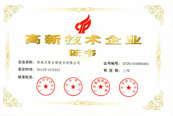 近日,廣東省科學(xué)技術(shù)廳、廣東省財(cái)政廳、廣東省國家稅務(wù)局和廣東省地方稅務(wù)局聯(lián)合下發(fā)了《關(guān)于公布廣東省2014年第一、二批通過復(fù)審高新技術(shù)企業(yè)名單的通知》(粵科高字[2015]31號)文件,珠海貝索生物技術(shù)有限公司順利通過高新技術(shù)企業(yè)復(fù)審(證書編號:GF201444000384)并重獲頒牌。
