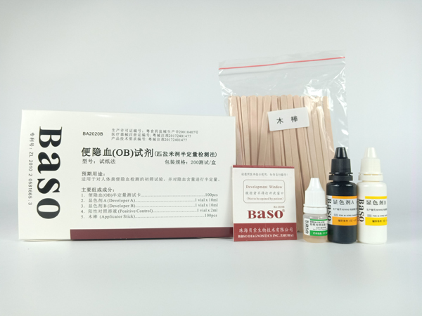 傳統(tǒng)的匹拉米洞法敏感性較低,而且呈色時間非常短,尤其是在弱陽性時判讀較不容易。貝索(BaSO )便隱血(OB)試劑是改良的匹拉米洞配方,其敏感性適中,呈色可穩(wěn)定30分鐘,方便判讀。特別對弱陽性結(jié)果的判讀表現(xiàn)較明顯,是目前檢測糞便隱血較先進的化學法試劑。