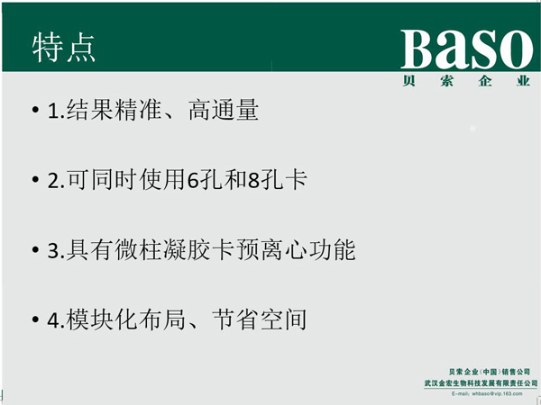 貝索全自動(dòng)血型分析儀適用于微柱凝膠法檢測(cè),操作簡(jiǎn)便,敏感性高,可檢出低含量抗原抗體,結(jié)果清晰可靠、便于保存,并滿足多種數(shù)據(jù)管理的要求,適用于各類大中小醫(yī)院、血站、疾控中心等單位的ABO血型正反定型、Rh血型鑒定和不規(guī)則抗體篩選、交叉配血等實(shí)驗(yàn)自動(dòng)化檢測(cè)。