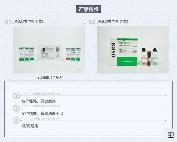 貝索生物最新推出的二抗試劑盒是基于聚合物技術(shù)的新一代免疫組化非生物素檢測系統(tǒng),將多個抗鼠和抗兔的IgG分子標(biāo)記在辣根過氧化物酶聚合物上,所形成的聚合物直接與一抗結(jié)合,從而放大了抗原抗體結(jié)合的信號,背景更清晰,定位準(zhǔn)確,鼠、兔抗體均適用,為兔/小鼠通用型即用型試劑盒。試劑盒中含有穩(wěn)定的DAB色原和底物緩沖液,染色時間容易控制,顏色鮮明,不易出現(xiàn)背景。